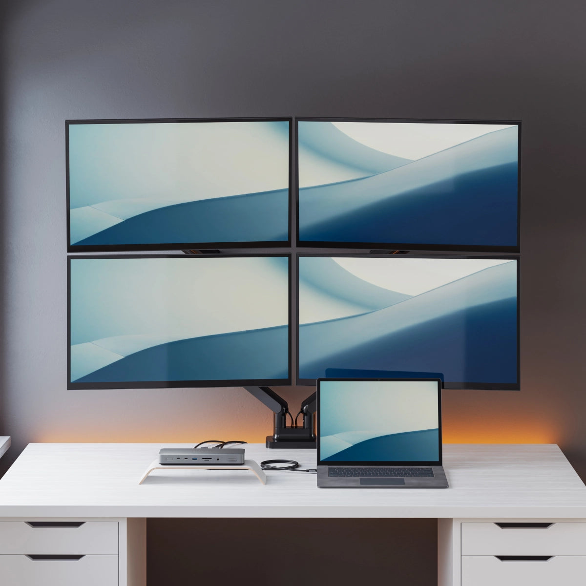 When linked to a computer that supports Thunderbolt (or many USB4 machines) the DU4 dock can connect up to four external displays in flexible combinations of the 2x HDMI, 3x DisplayPort and 2x Thunderbolt downstream ports*.